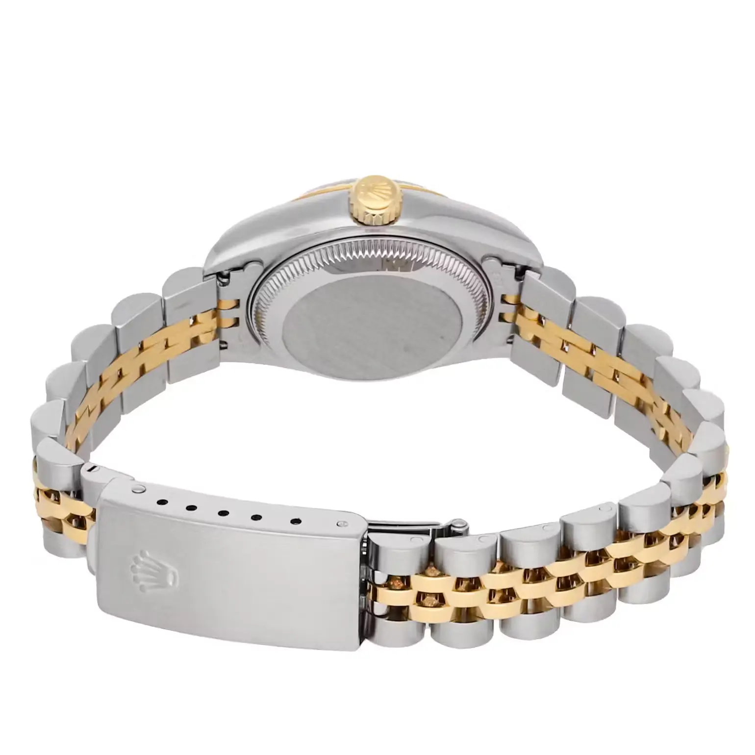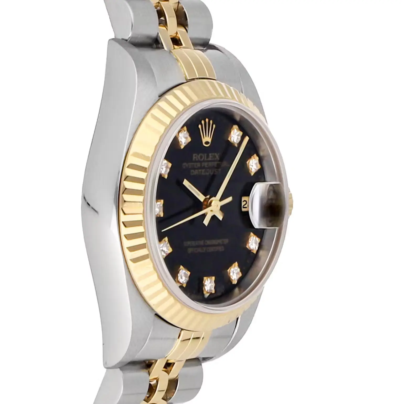Case & Dial: This exquisite ladies’ Rolex from 1993 features a 26mm stainless steel case with a striking black dial adorned with diamond hour markers. The round case is complemented by a solid caseback and is designed for a sophisticated look.
